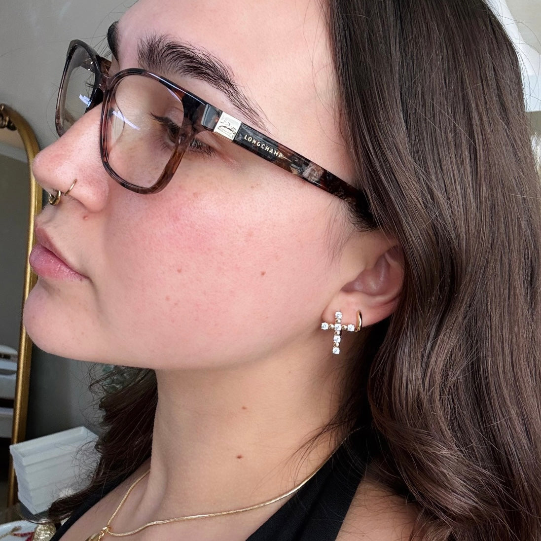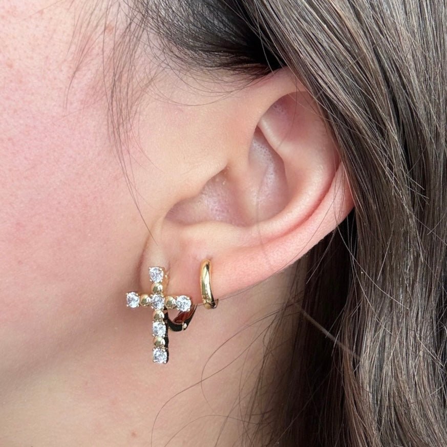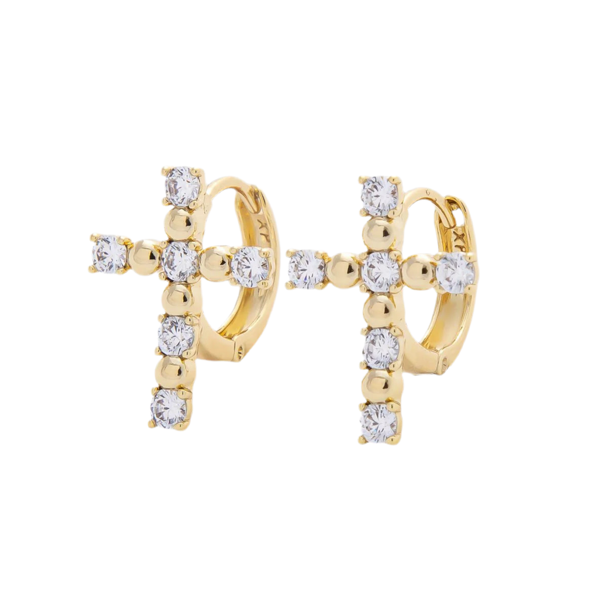 14K Gold Filled Clear CZ Beaded Bubble Religious Cross Huggie Earrings
