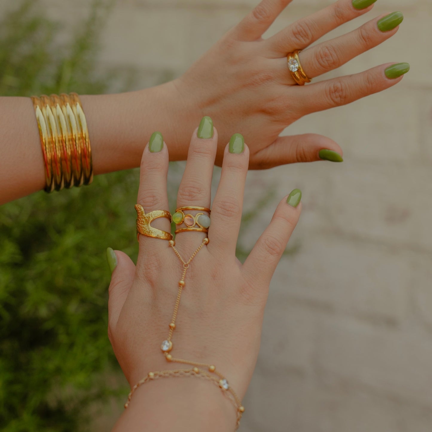 SPICE UP YOUR SUMMER FITS WITH OUR GOLDEN HOUR BANGLE. RIBBED TEXTURED GOLD BANGLE. WATERPROOF AND HYPOALLERGENIC.