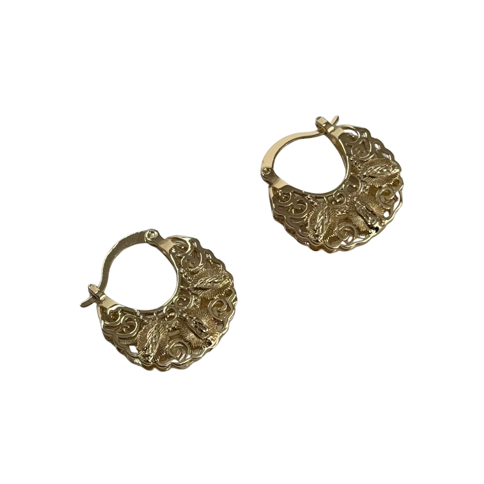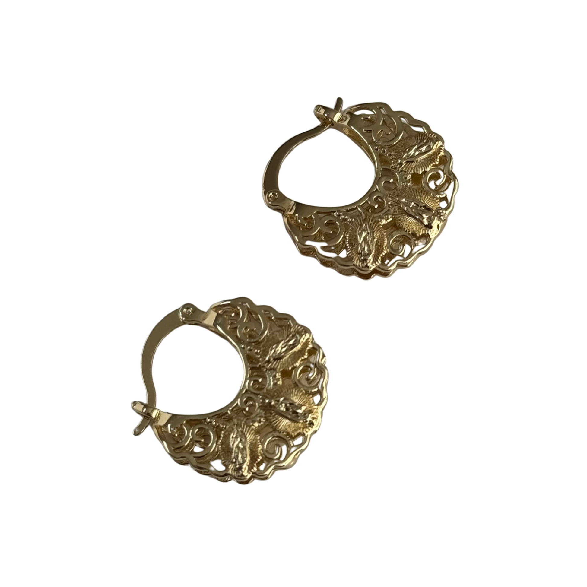 14K GOLD FILLED LIGHTWEIGHT TEXTURED MEDIUM HOOPS WITH VIRGIN MARY DESIGN