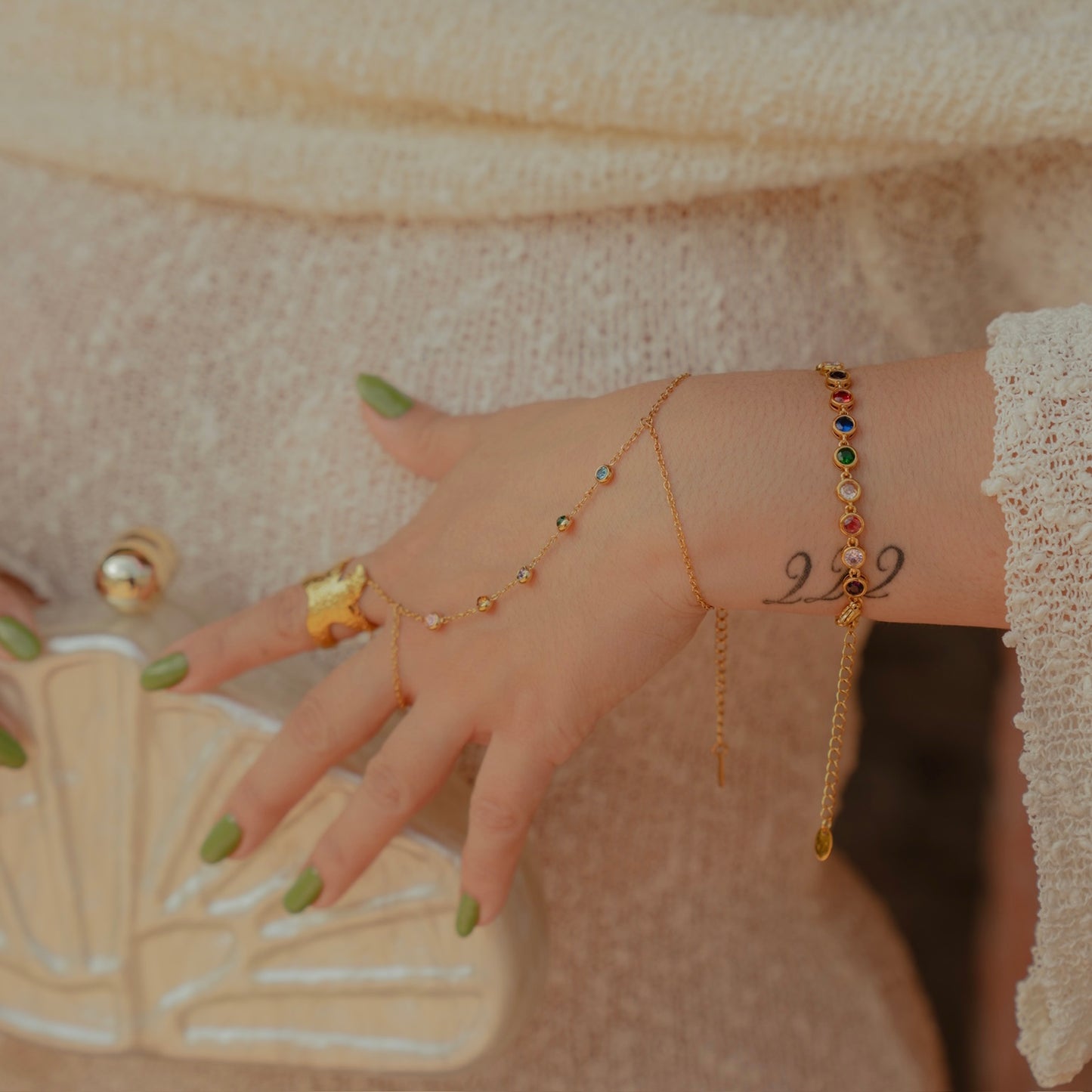 NOTHING SCREAMS SUMMER LIKE A HAND CHAIN WITH A POP OF COLOR. CABLE CHAIN HAND CHAIN WITH MULTI-COLORED CZ'S. WATERPROOF AND HYPOALLERGENIC.